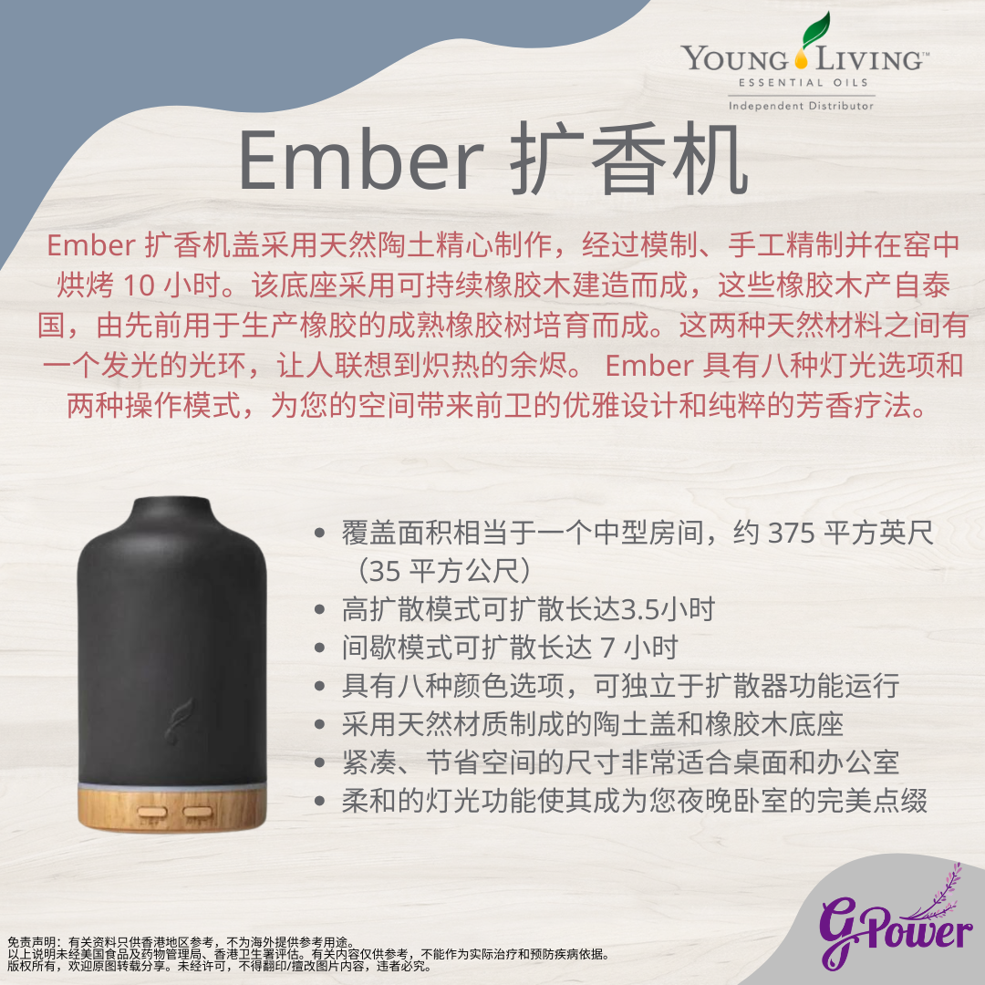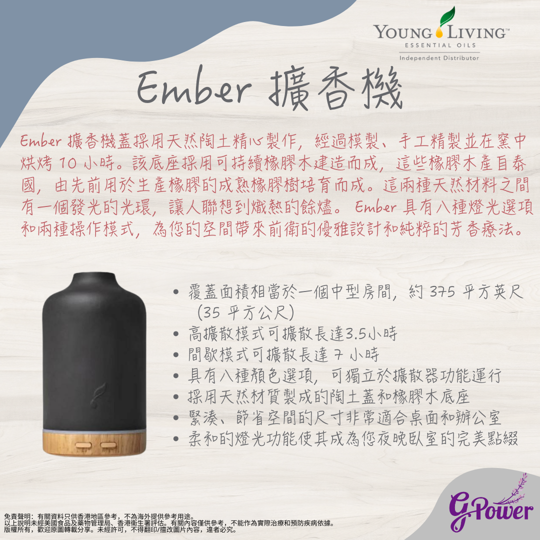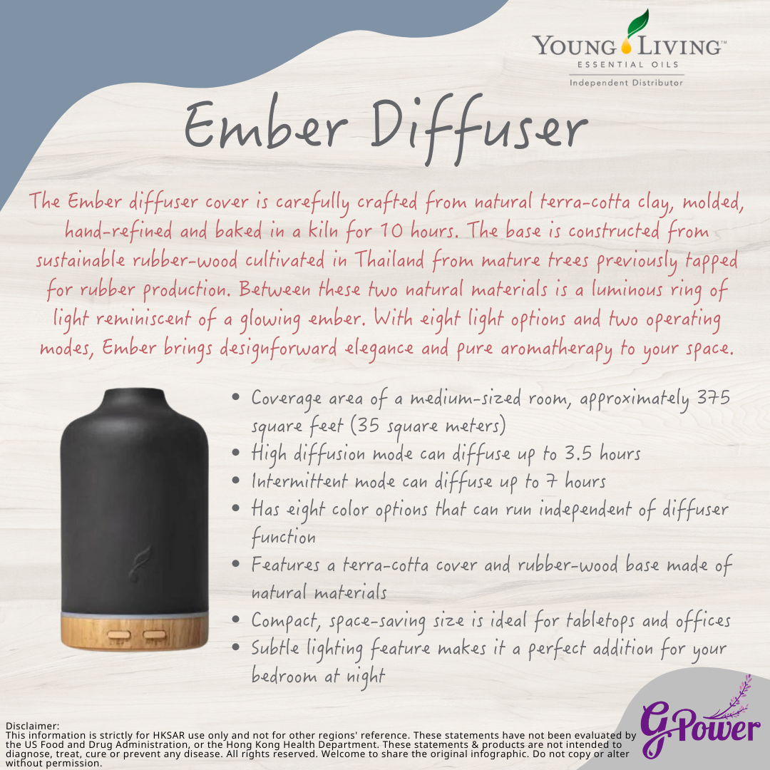 Ember 擴香機蓋採用天然陶土精心製作,經過模製、手工精製並在窯中烘烤 10 小時。該底座採用可持續橡膠木建造而成,這些橡膠木產自泰國,由先前用於生產橡膠的成熟橡膠樹培育而成。這兩種天然材料之間有一個發光的光環,讓人聯想到熾熱的餘燼。 Ember 具有八種燈光選項和兩種操作模式,為您的空間帶來前衛的優雅設計和純粹的芳香療法。