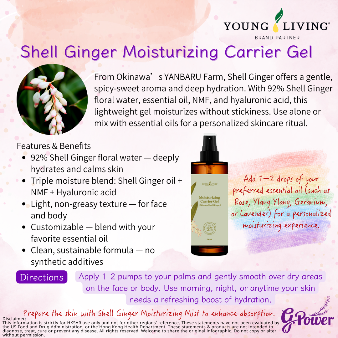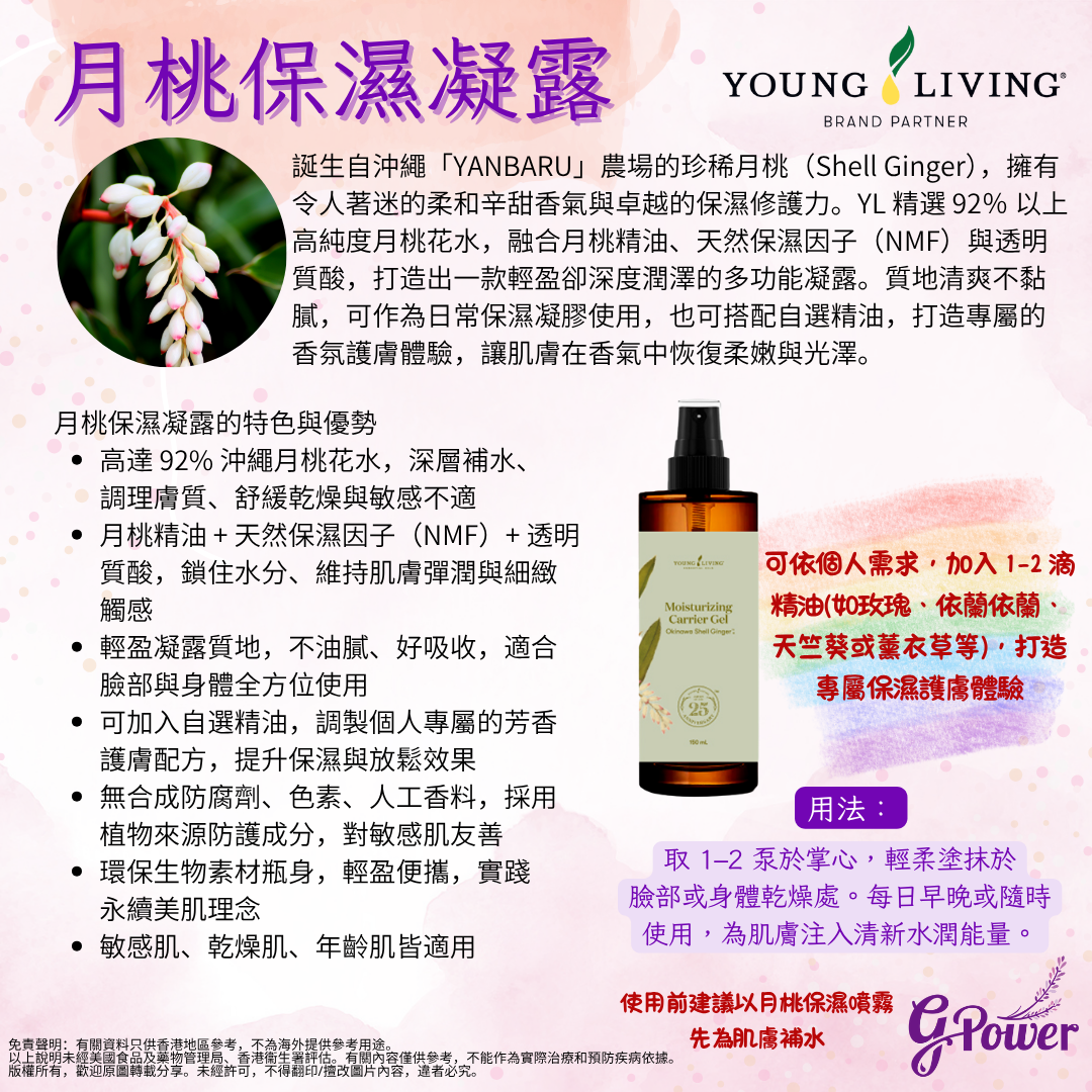 誕生自沖繩「YANBARU」農場的珍稀月桃(Shell Ginger),擁有令人著迷的柔和辛甜香氣與卓越的保濕修護力。Young Living 精選 92% 以上高純度月桃花水,融合月桃精油、天然保濕因子(NMF)與透明質酸,打造出一款輕盈卻深度潤澤的多功能凝露。質地清爽不黏膩,可作為日常保濕凝膠使用,也可搭配自選精油,打造專屬的香氛護膚體驗,讓肌膚在香氣中恢復柔嫩與光澤。