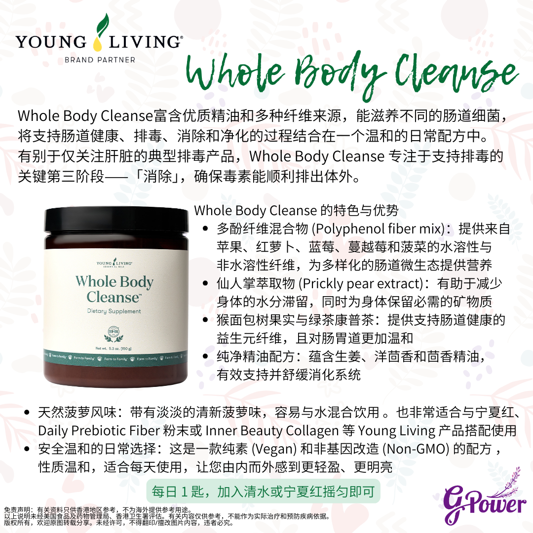 Whole Body Cleanse富含優質精油和多種纖維來源,能滋養不同的腸道細菌,將支持腸道健康、排毒、消除和淨化的過程結合在一個溫和的日常配方中 。有別於僅關注肝臟的典型排毒產品,Whole Body Cleanse 專注於支持排毒的關鍵第三階段——「消除」,確保毒素能順利排出體外。