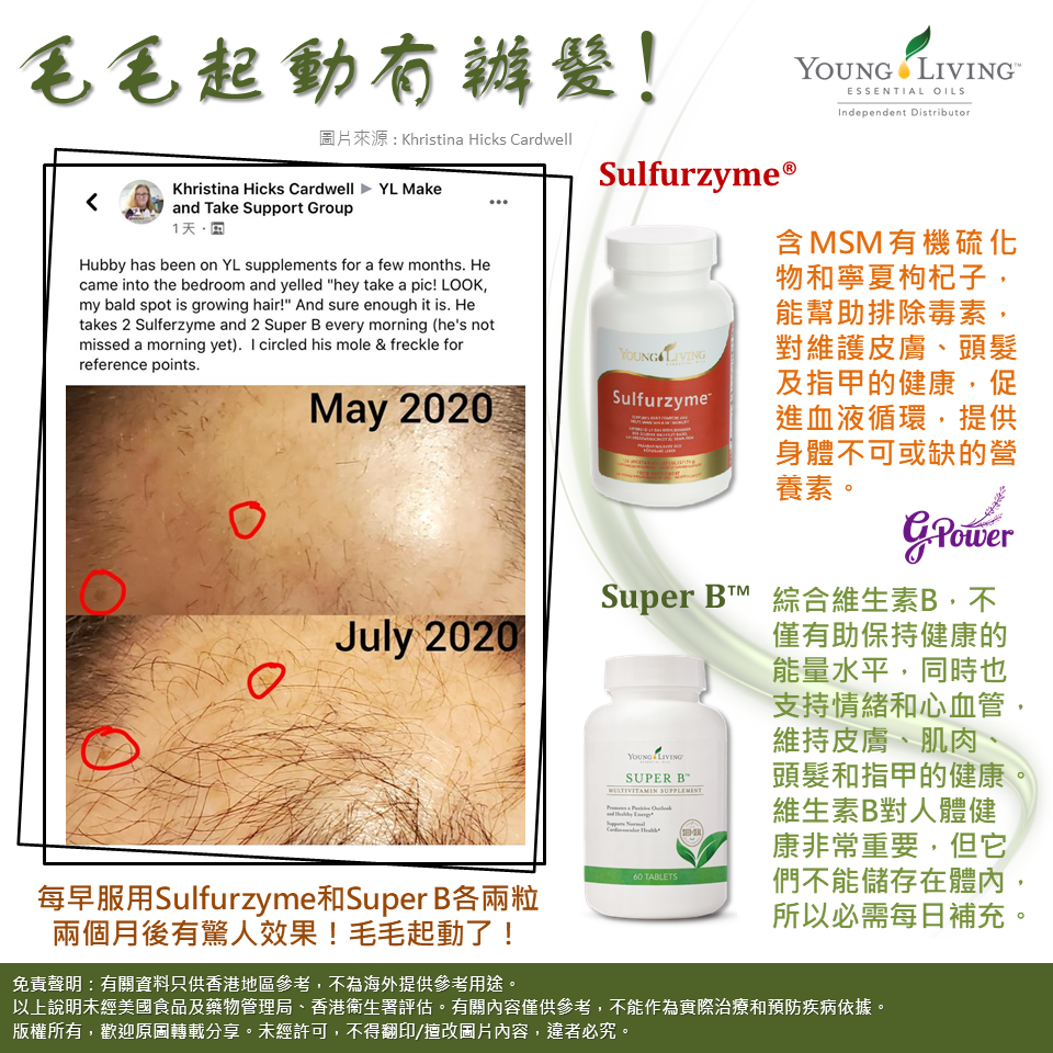 她的丈夫每早服用 Sulfurzyme 和 Super B 各兩粒,兩個月後有驚人效果!毛毛起動了!......