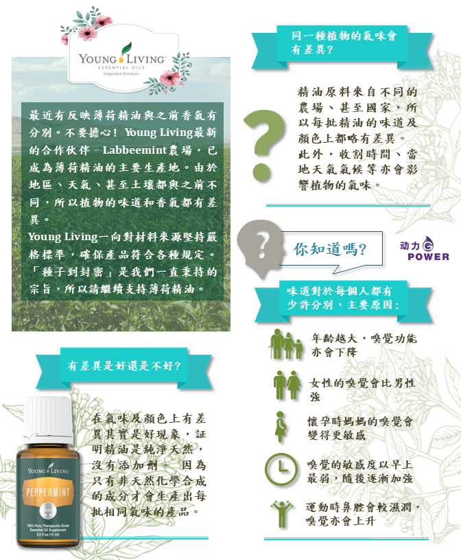 Young Living精油是純天然從植物中萃取的芳香物質, 同一種植物由於其生長的氣候🌦、土壤🌱、濕度🌧、溫度🌞、海拔⛰等自然條件的不同, 其內部化學成分與比例也有所差異, 更不要說是氣味和顏色了。 而且每個人的嗅覺也存在著差異, 可想而知精油氣味有所偏差是很正常的 ......