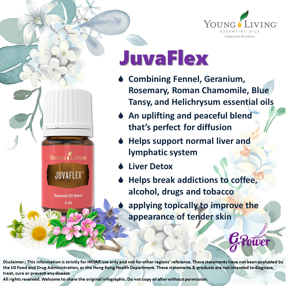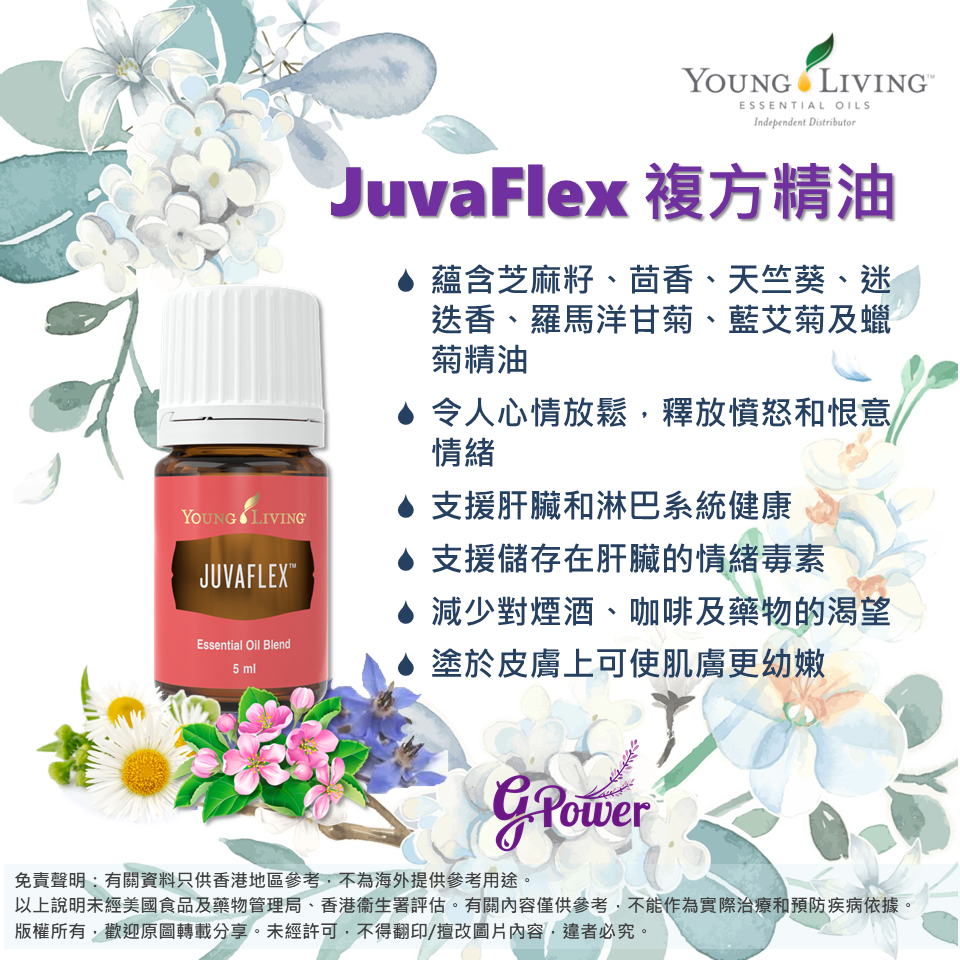 JuvaFlex精油由茴香、天竺葵、羅馬洋甘菊、藍艾菊及蠟菊配方而成,是一款可令人心情放鬆的複方精油,可用於擴香。塗於表膚上更可使用肌膚看起來更幼嫩。