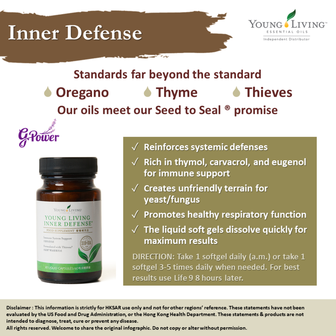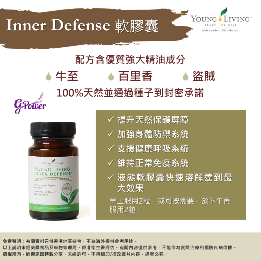 Inner Defense®蘊含多種強大的精油,如盜賊、牛至及百里香,加強身體的天然保護屏障,維持正常的免疫系統及呼吸系統健康。