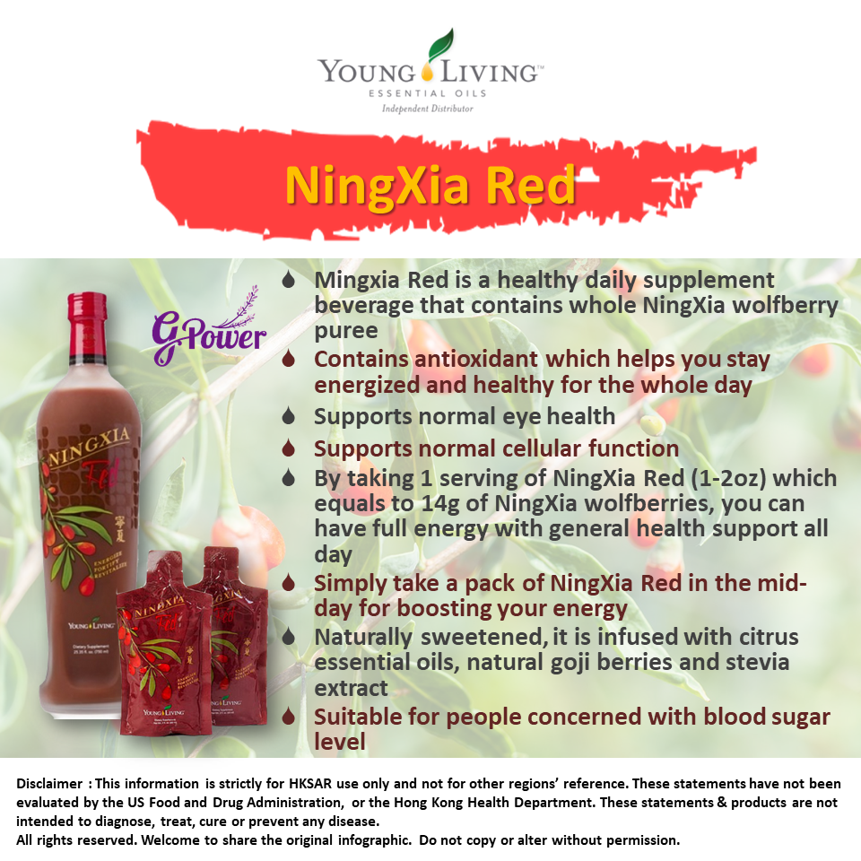 現時寧夏紅每年全球暢銷將近460萬公升,是市場上唯一一種將原粒寧夏枸杞和精油結合的營養飲料。我們不但提取枸杞果汁的營養精華,還保留果肉、果皮和果實的營養,加上超級水果配方及4種含天然檸檬烯的純淨柑橘精油,喚發水潤亮澤肌膚。1份寧夏紅(1oz至2oz)就等於14g寧夏枸杞,為您提供每日身體營養所需,讓您時刻充滿活力、保持健康!