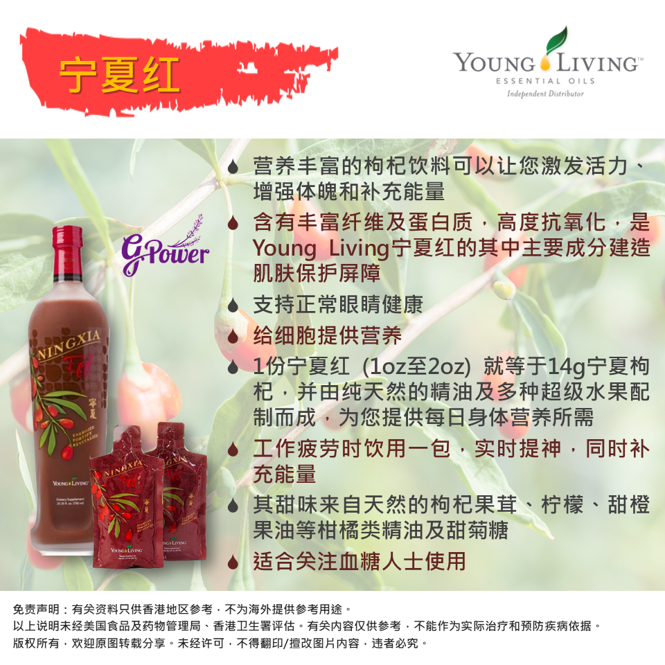 「超級水果」寧夏枸杞被傳統中醫採用超過20年,含有豐富纖維及蛋白質,高度抗氧化,是Young Living寧夏紅的其中主要成分。1993年,D. Gary Young與中國科學家Dr. Songqiao Chao趙博士會面。趙博士介紹了一種在中國沿用數千年的美味水果—枸杞子,解釋經常進食這種水果的人較為長壽及健康,Gary 因此決心將這種「超級水果」帶給全世界。他以枸杞製作出健康果汁飲料—寧夏紅,促成了這款超級飲品的誕生!