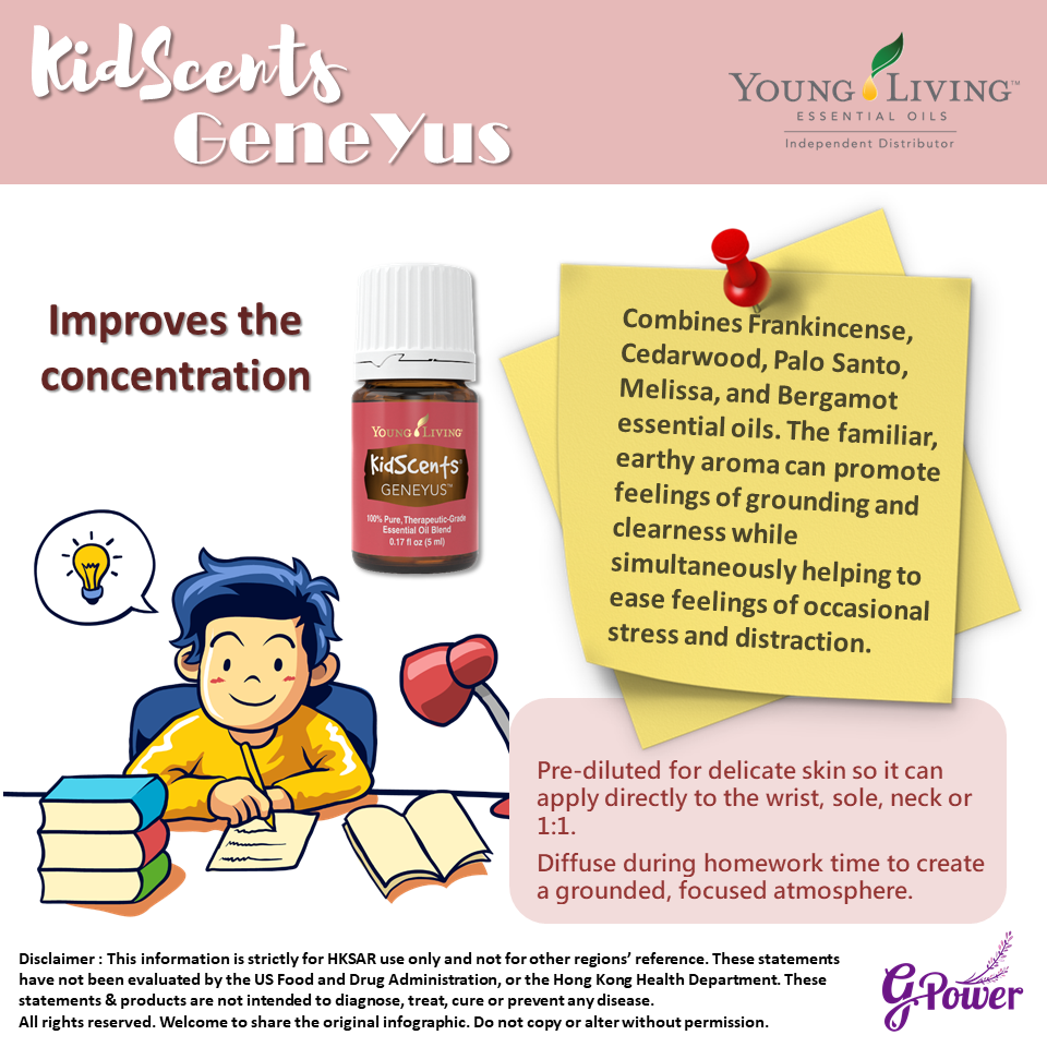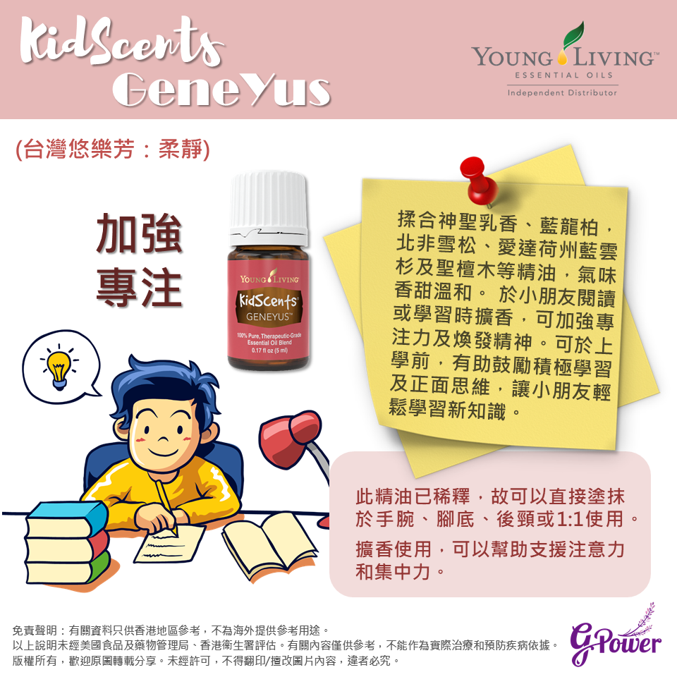 GeneYus™複方精油揉合神聖乳香、藍龍柏,北非雪松、愛達荷州藍雲杉及聖檀木等精油,氣味香甜溫和。 於小朋友閱讀或學習時擴香,可加強專注力。可於上學前,有助鼓勵積極學習及正面思維,讓小朋友輕鬆學習新知識。