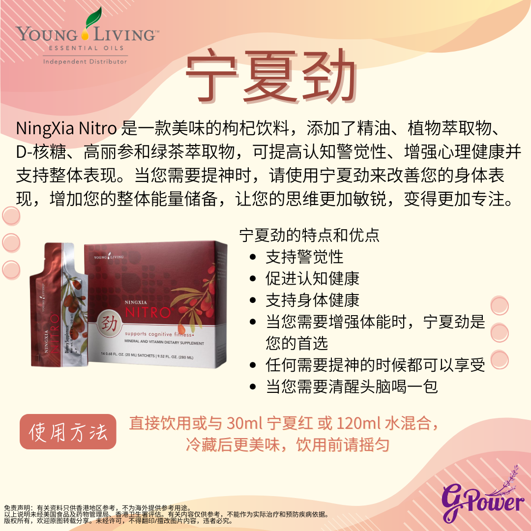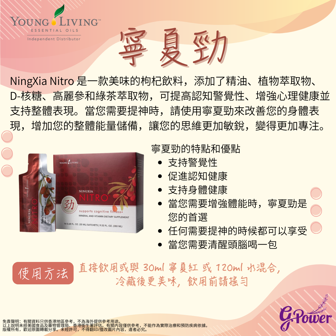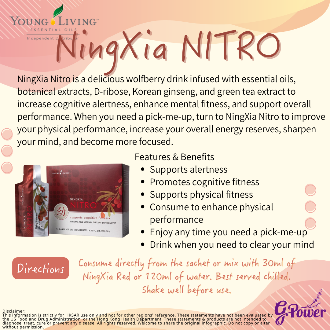 NingXia Nitro®寧夏勁是一種美味的枸杞飲料,蘊含精油、植物萃取精華、D-核糖、高麗參和綠茶提取物,提高認知能力、幫助增強身心健康,支援整體表現。當您需要提神醒腦時,飲用NingXia Nitro寧夏勁以提升體能表現,補充能量,即時提神醒腦,讓您的頭腦更敏銳、更集中。