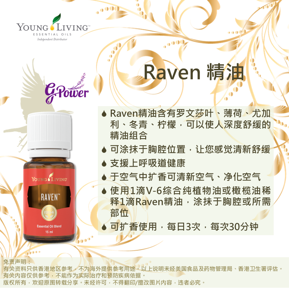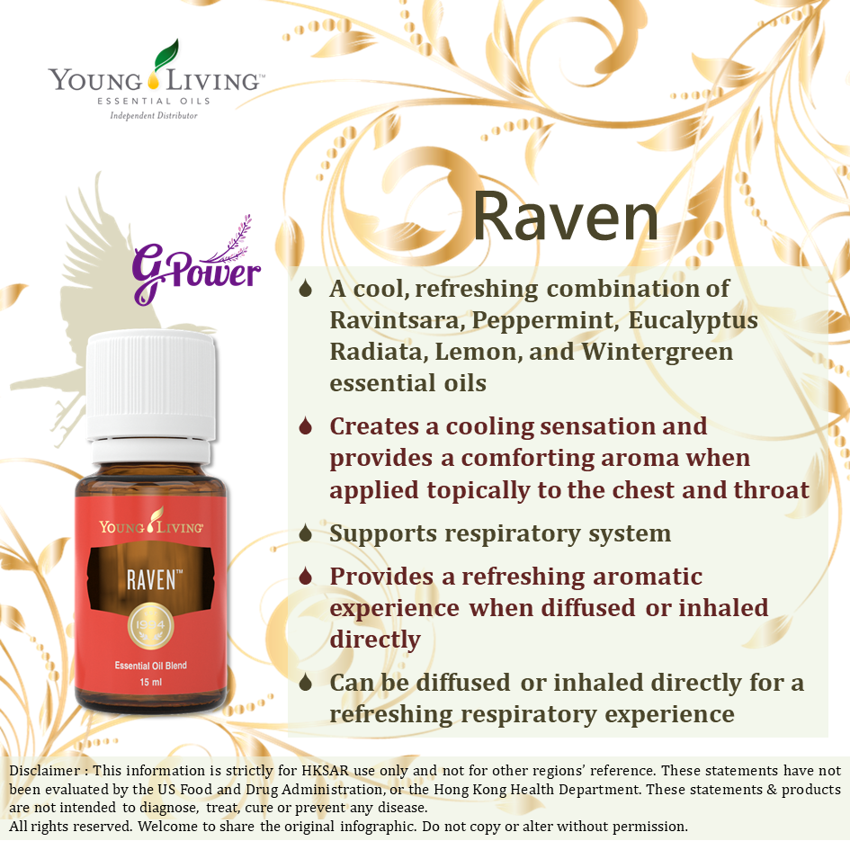 Raven複方精油揉合羅文莎葉、薄荷、尤加利、檸檬與冬青精油,帶給您清涼的感受。 它涼涼的薄荷味中微帶甜美香氣,塗抹於胸前或喉嚨時,給您舒服的香氣與清涼舒爽的感受。 就像一陣充滿活力的微風,吹過尤加利樹林,當擴香或直接吸嗅Raven 複方精油,都可感受到它的清涼香氣。 它含有天然的桉葉油醇、薄荷醇與水楊酸甲酯,讓人感覺精力充沛、充滿自信,特別適合在運動前後或夜晚放鬆時使用。